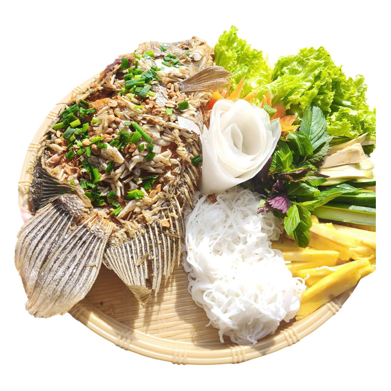 Cá tươi chế biến đậm đà, ăn kèm rau và bún, giữ trọn vị ngọt tự nhiên của cá sông.
